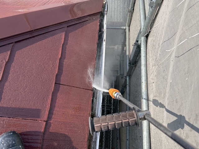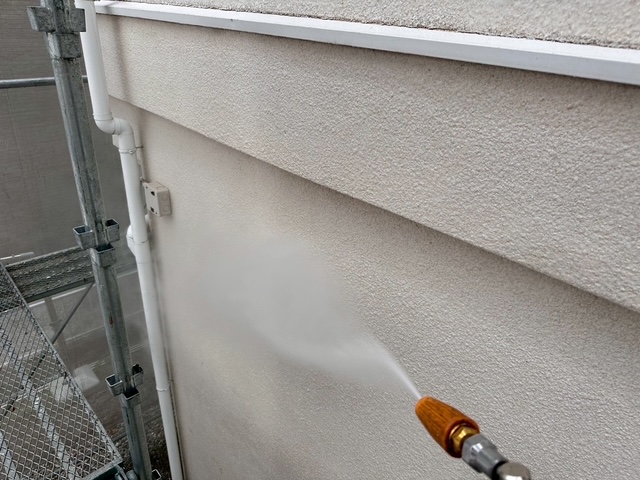 外壁塗装工事や屋根塗装工事では、塗装前(塗料を塗る前)に、高圧洗浄機を使用して、高圧の水で外壁に付着した汚れや傷んだ旧塗膜などを洗い流します。