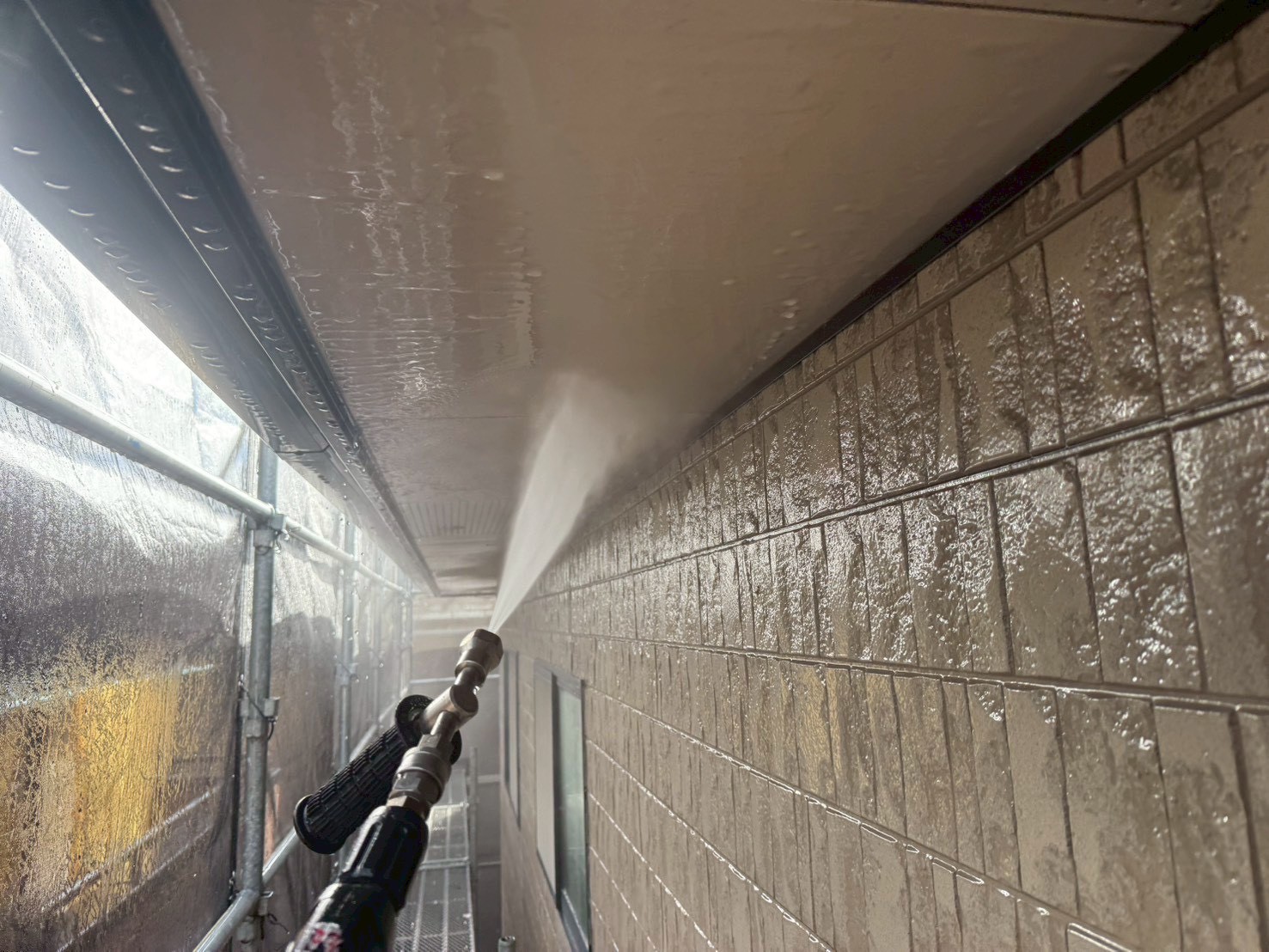 4. 外壁、付帯部と徐々に下へ高圧洗浄を行います