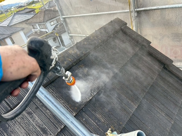外壁塗装工事や屋根塗装工事では、塗装前(塗料を塗る前)に、高圧洗浄機を使用して、高圧の水で外壁に付着した汚れや傷んだ旧塗膜などを洗い流します。