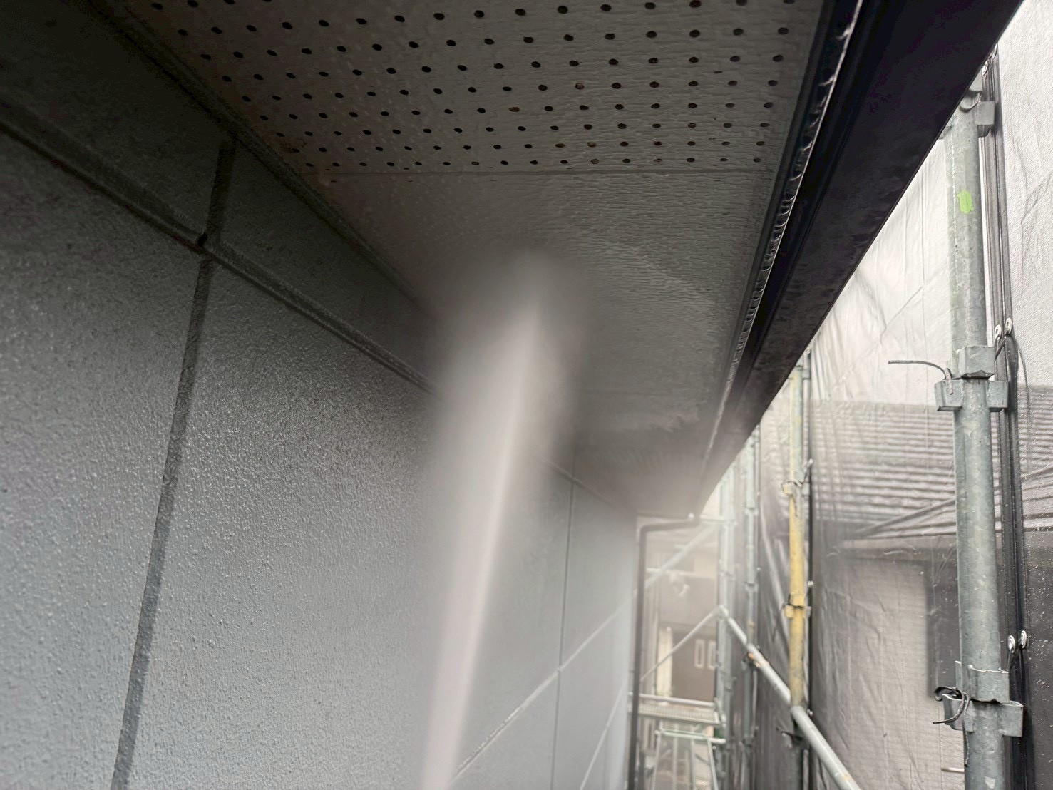 外壁塗装工事や屋根塗装工事では、塗装前(塗料を塗る前)に、高圧洗浄機を使用して、高圧の水で外壁に付着した汚れや傷んだ旧塗膜などを洗い流します。