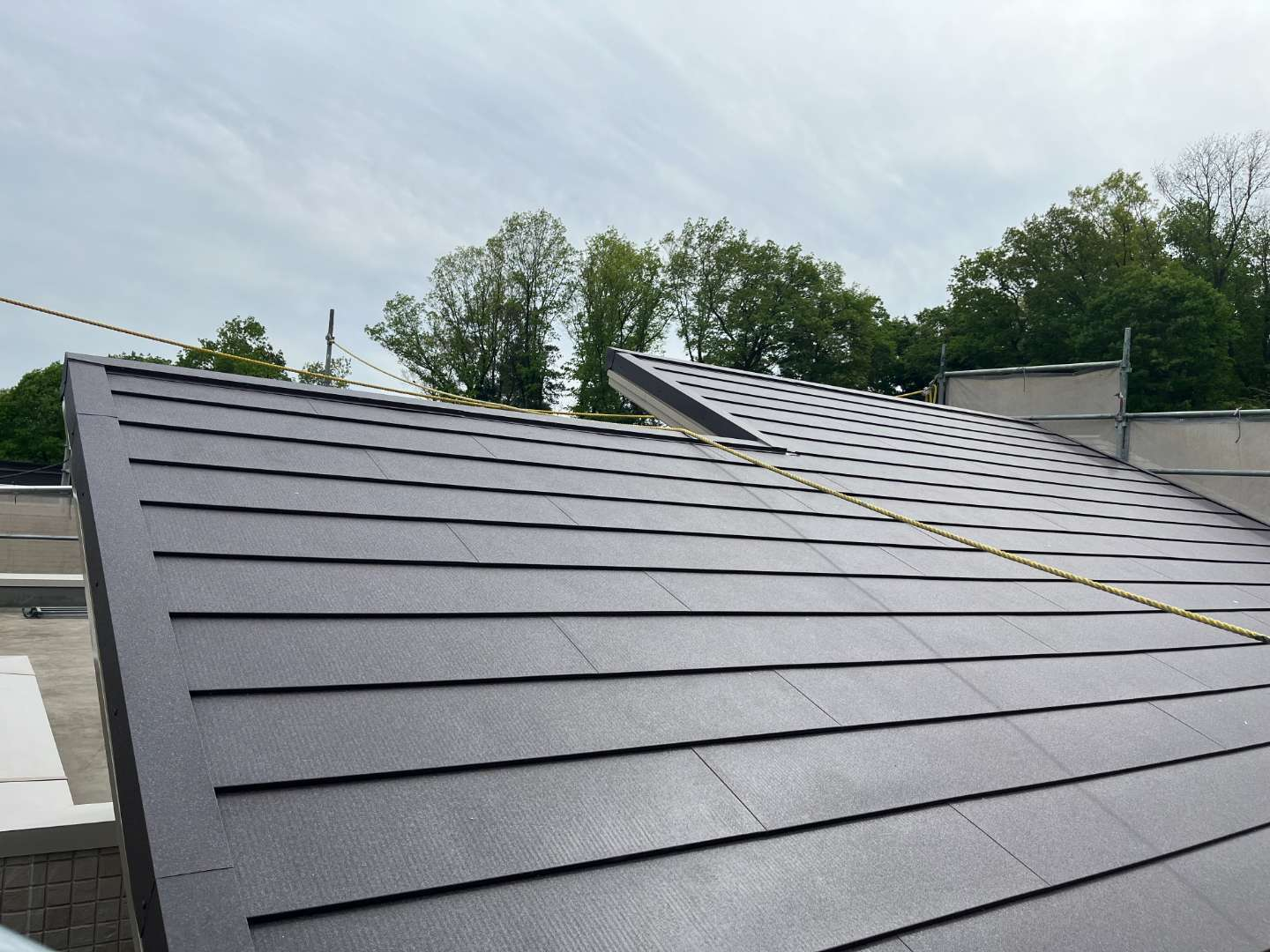 その後、ガルバリウム鋼板などの屋根材を葺き、棟板金や雨押さえなどの役物を取り付けて工事完了となります。